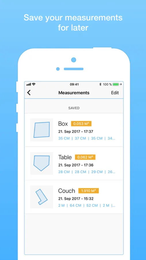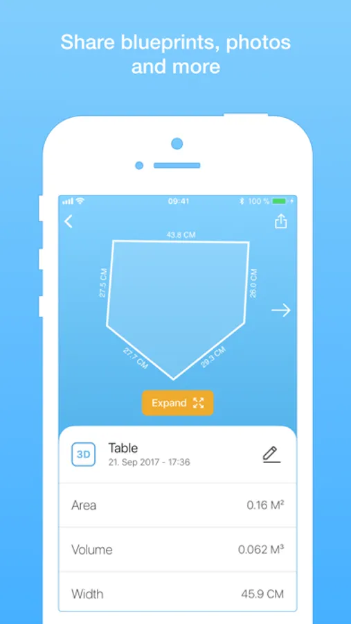 - Save & Share: Save and share your measurements as blueprints, photos and 3D objects.