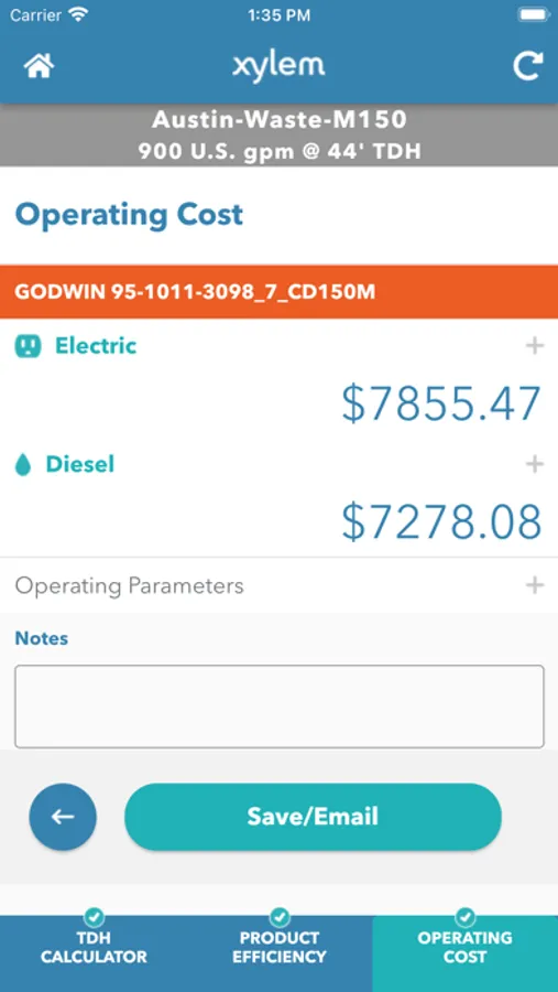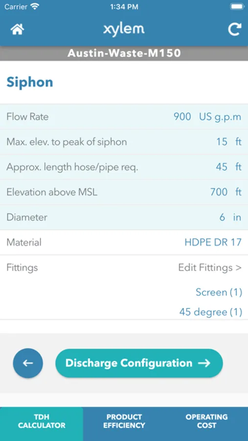 User can enter Suction and Discharge configurations (pipe/hose/fittings), pump efficiency, duration of operation and energy costs. The app will calculate energy consumption and costs over the period of operation.