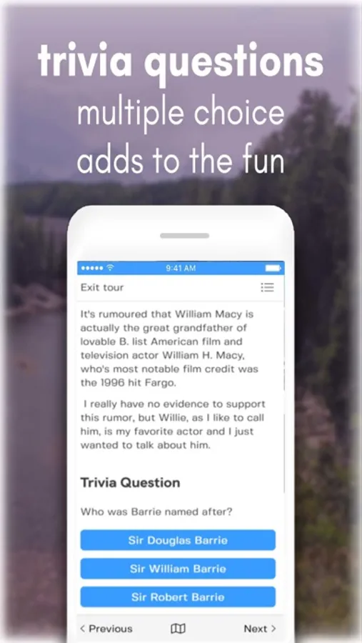 Each point of interest on both driving and walking tours has an optional location based trivia question. Challenge your friends or just play for fun! Hands free while driving, device based when walking.