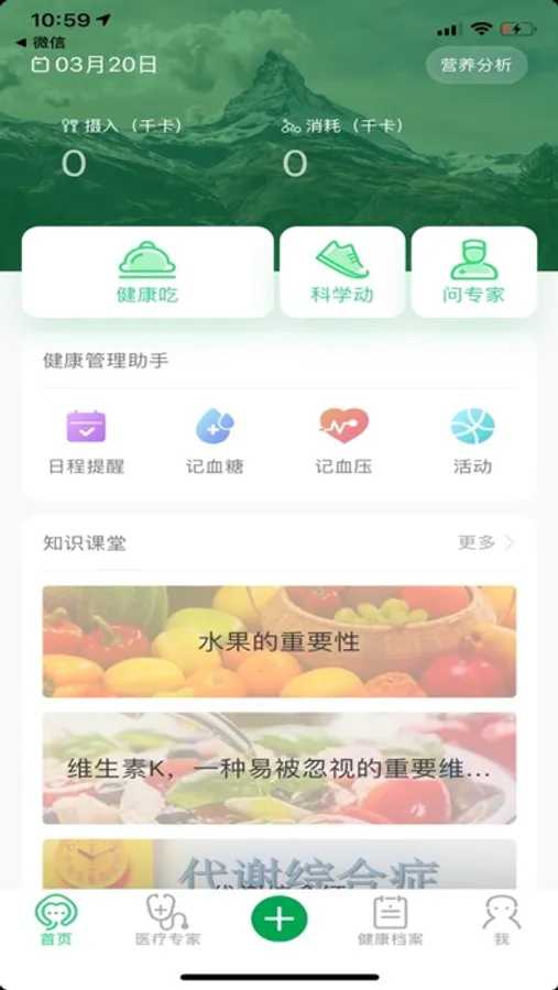 “科学动”、“问专家”、“日程提醒”、“活动”、“记血糖