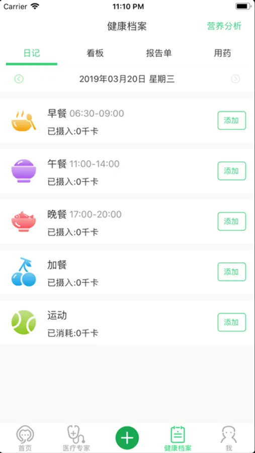 3. 主页面上中间“+”号点击可添加:饮食记录/运动记