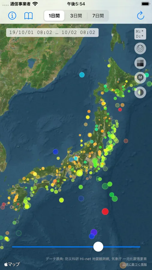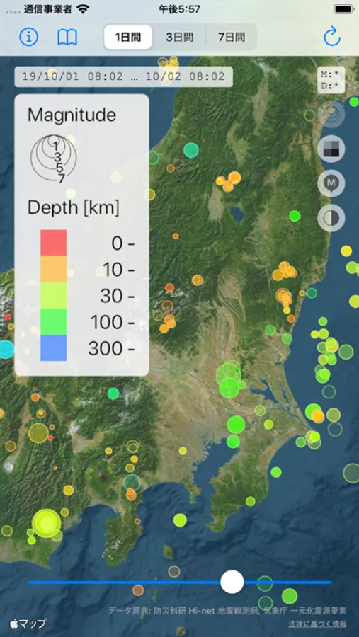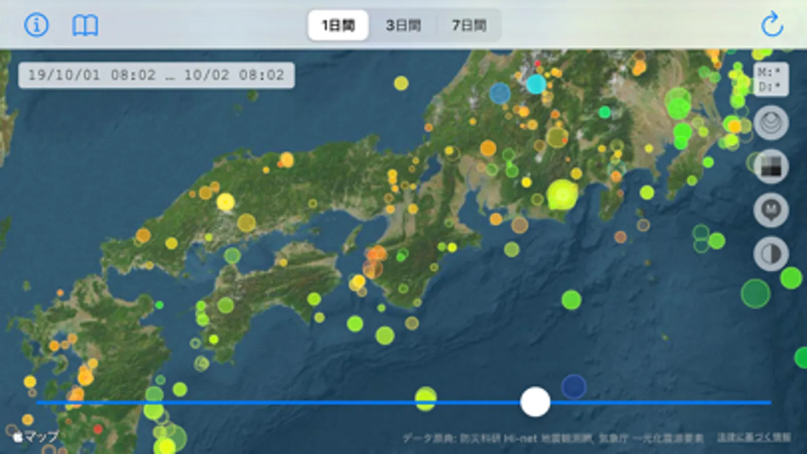 - Visualize the tendency of the earthquake occurrence in an easy-to-understand manner by operating the slider. Automatic playback is also available.