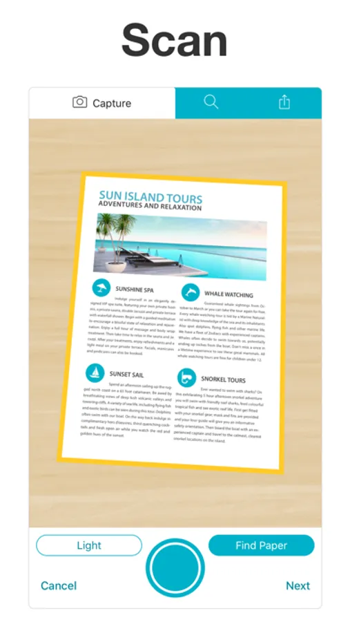 Camera works as a cam scanner and will automatically detect paper when placed on a contrasting background. Scan one page or multiple pages at the same time with Scan App +.