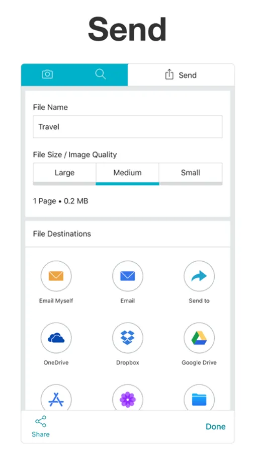 Email pdf files of your scanned docs. Scan App + can upload directly to Google Drive, Dropbox, OneDrive. Save scanned photos to Photos App. Save to iCloud via Files App or send to another app. With 9 export options Scan App + makes it easy to send document scans.