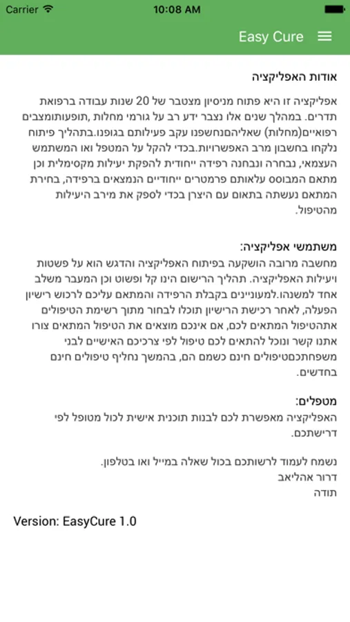 האפליקציה מאפשרת לכם לבנות תוכנית אישית לכול מטופל לפי דרישתכם. נשמח לעמוד לרשותכם בכול שאלה במייל ואו בטלפון.