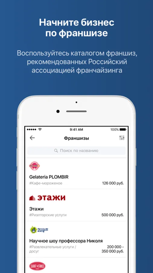 Выберите из каталога франшизы, которые Вам интересны – по сумме инвестиций, сроку окупаемости или стоимости. Франшизы одобрены Российской Ассоциацией Франчайзинга.