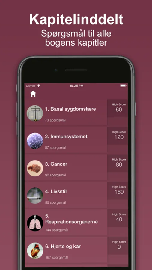 Kategorier og spørgsmål tager udgangspunkt i lærebogen Sygdomslære - hånden på hjertet 2. udgave af Arne Lykke Viborg m.fl. For hver quiz kan du se en status over dine besvarelser af netop denne quiz og du kan dyste mod dine venner og læsemakker med funktionen 1 mod 1. Bemærk multiplayer 1 mod 1 kræver at du er logget ind på Game Center.