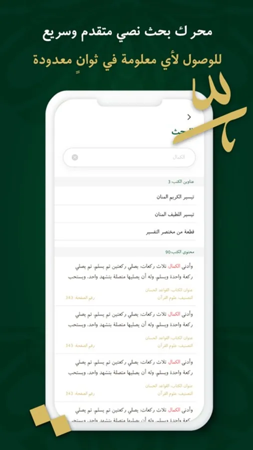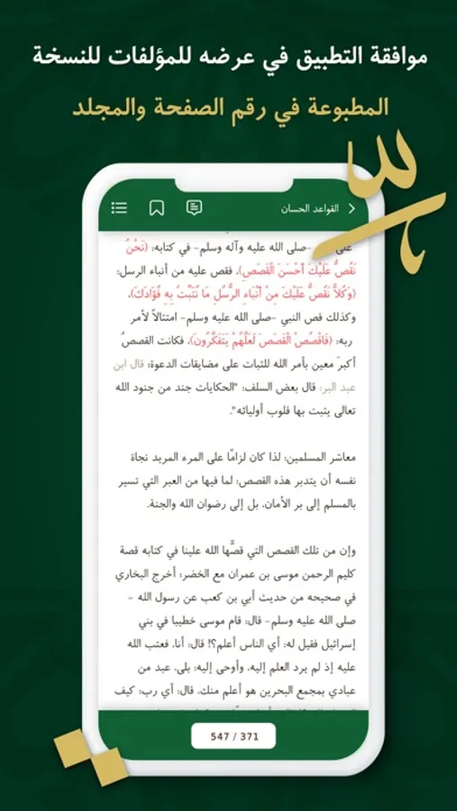 موافقة التطبيق في عرضه للمؤلفات للنسخة المطبوعة في رقم الصفحة والمجلد لمساعدة طالب العلم والباحثين في أغراض التوثيق العلمي.