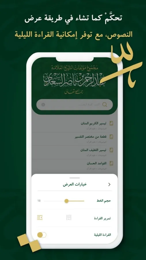 تحكَّمْ كما تشاء في طريقة عرض النصوص، فبإمكانك تغيير نوع الخط ولونه وحجمه، وكذلك لون الخلفية وإمكانية القراءة بالنمط الليلي.