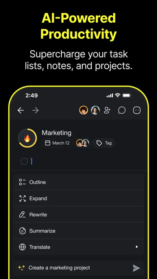 Introducing Taskade AI - your all-in-one writing assistant that will supercharge your productivity! With just a few taps, you can get instant answers to complex questions, generate notes and outlines, organize your writing, and summarize long-form content. And the best part? It's completely free!