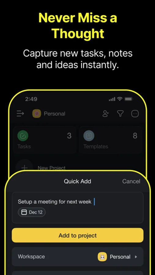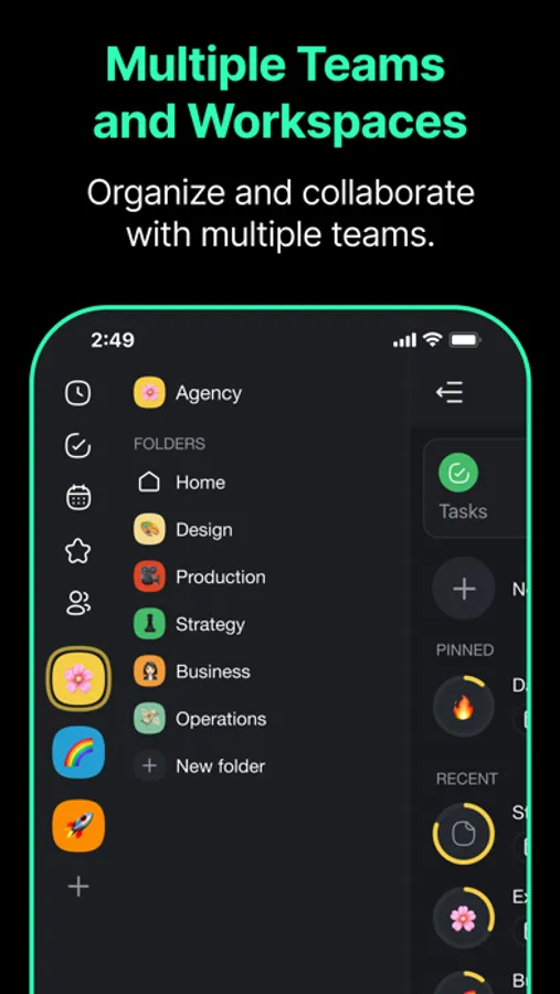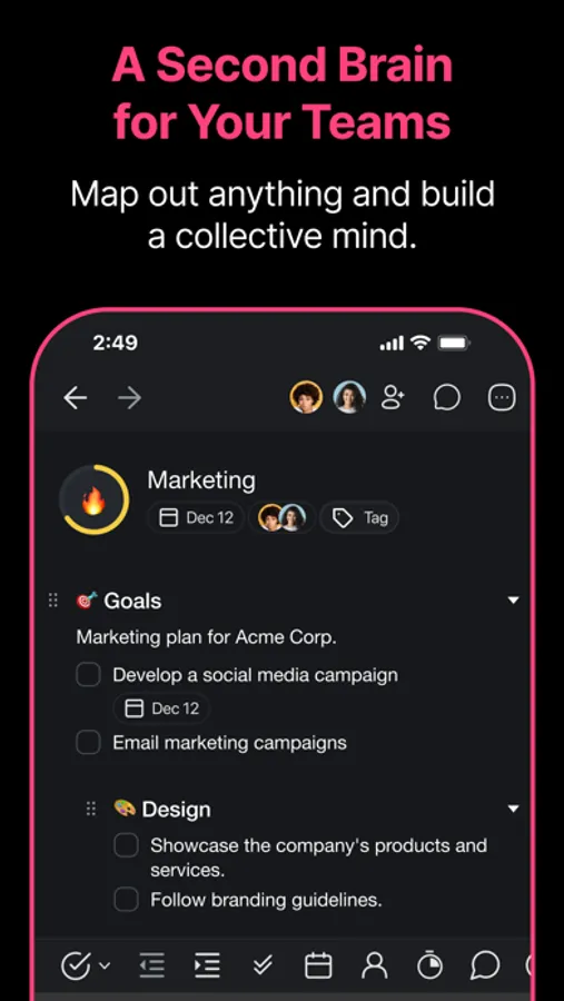 A workspace is a collection of projects. Workspaces help to keep your task lists and notes organized. Make workspaces collaborative by inviting team members. Team members can edit all projects inside and collaborate in real-time. Team members will also receive push notifications for any updates inside.