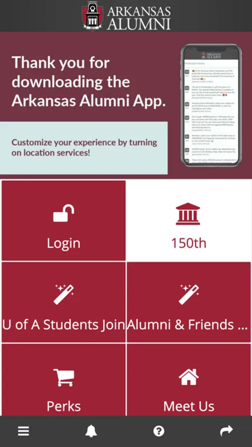 The Arkansas Alumni App connects alumni, friends and fans of the University of Arkansas and brings the power of your Alumni Association membership to your fingertips! Find Arkansas Alumni events near you and receive the latest news from the Hill! Members can also access a mobile membership card, enjoy benefits and discounts on the go, and easily renew your membership from your phone. This FREE app is a must for all Arkansas Alumni, students, fans, friends and members!
