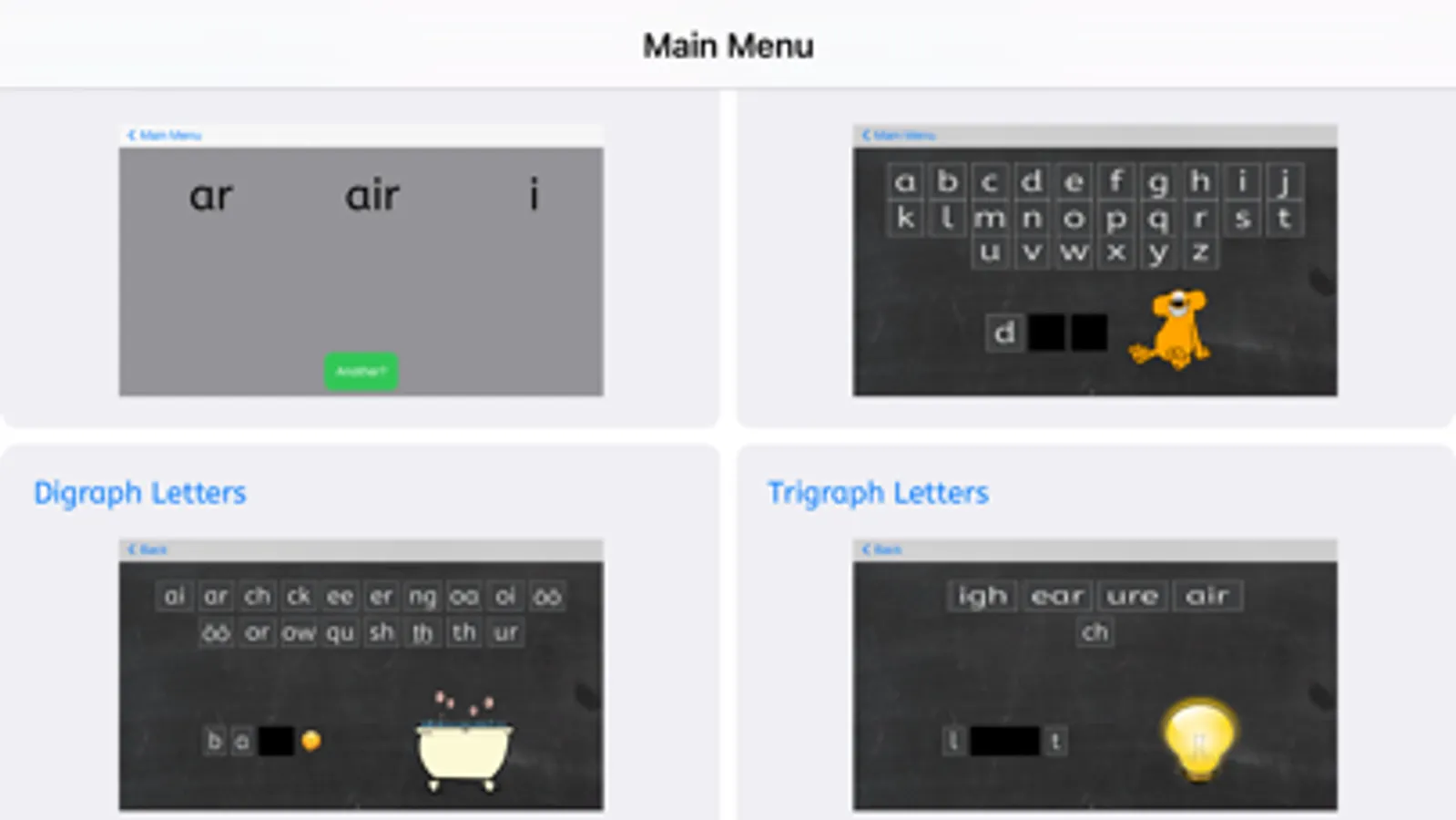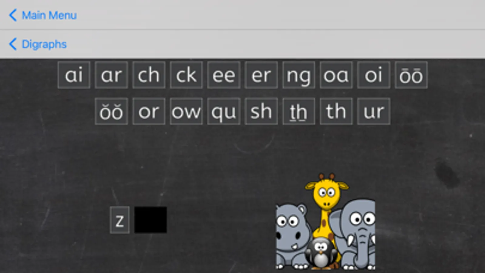 The words get more complex, and the app includes the whole synthetic alphabet, which provides for sh, ch, th, ck, ng, ee, oa, ow, oo, ie, air, ue, oi, ar, or.