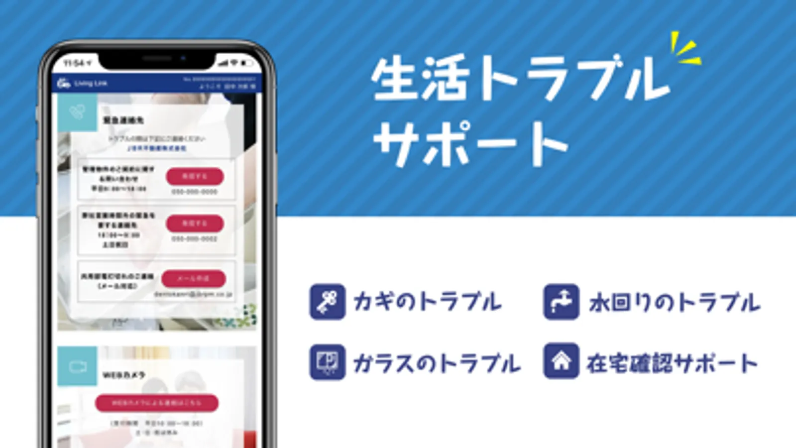 日々の生活の中で起こりうる、カギ紛失や水まわりのトラブル、ちょっとした不注意でガラスを割ってしまったなどの生活トラブル発生時にいつでも連絡がとれるので安心です。また、健康や地域情報に関するご相談など、何時起こるかもしれないトラブルにお応えします!