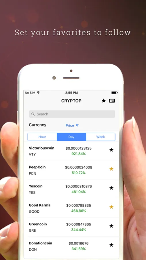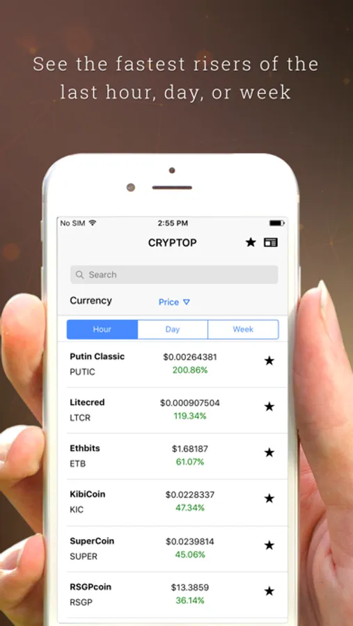 With CrypTop, you can easily monitor the hottest Crypto currencies, using the simple hourly, daily and weekly overview. See the fastest risers of the last hour, day, or week.