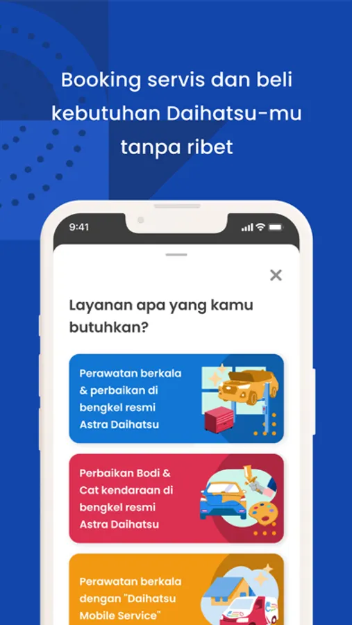 - Booking Service: memberikan kemudahan merawat mobil Daihatsu di bengkel Astra Daihatsu dengan keleluasaan memilih jadwal dan lokasi yang sudah pasti tersedia dengan jenis pekerjaan perawatan/perbaikan sesuai kebutuhan.