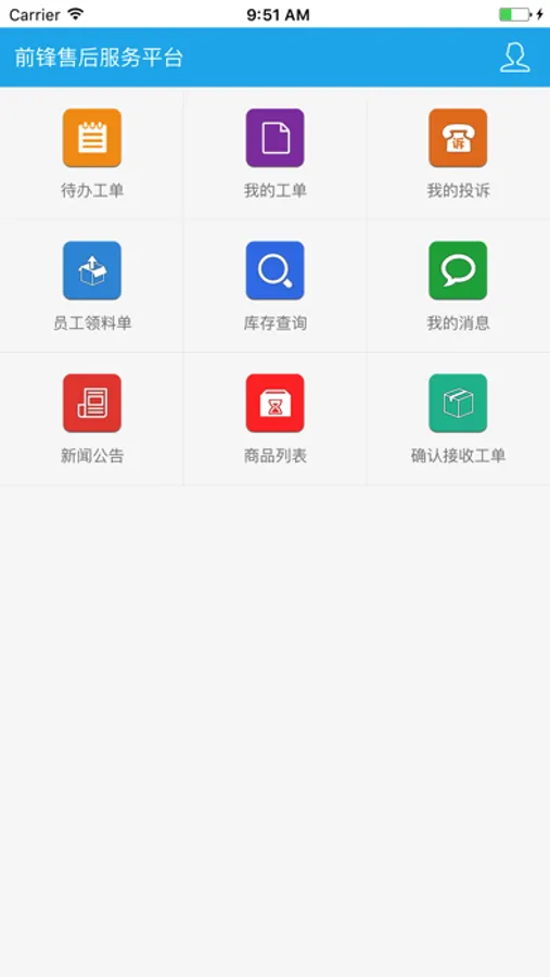 前锋售后手机端为前锋服务人员定制,通过手机接收后台的派工信息,确认自己的工单,查看待办工作,在上门服务前可打电话或发短信联系用户,也可定位用户地址。上门服务后,扫描上传产品的条码,拍照上传现场的照片和用户签名的单证。后台人员收到上传的信息和照片后,可确认和录入信息。还可以看通知公告、知识库、投诉。