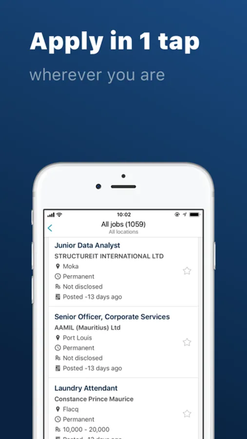 We are Mauritius’s leading recruitment website, listing hundreds of jobs from employers and recruitment agencies across Mauritius. Whether you want to take the next step in your career or find work more suitable for your skills and experience then the MyJob.mu job search app and website can help. In the MyJob.mu job app you will find a range of features designed to make your job search successful. With job alerts, on the go via push notifications, finding and applying for job opportunities is effortless. Got a free jobseeker account on MyJob.mu? Sync your MyJob.mu job search app with your desktop account and access your jobseeker profile across all devices. Take your career to the next level, download the MyJob.mu job app today and search the latest job opportunities in Mauritius.