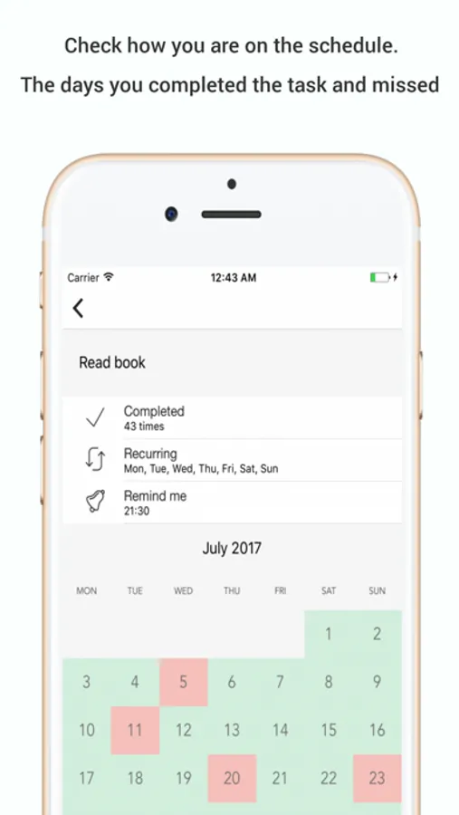 See how you are on schedule on the calendar view of task, on which days you completed it and on which days you missed it. See how many times you completed a task.