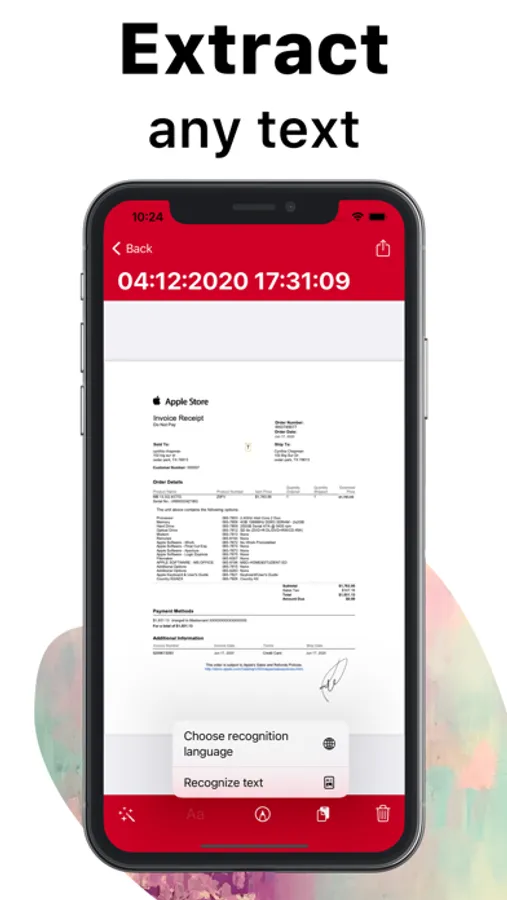 Convert any scan into a text that can be selected and copied. ScanPlus supports 61 recognition languages: Afrikaans, Albanian, Arabic, Basque, Bengali, Bulgarian, Catalan, Chinese (Traditional), Croatian, Czech, Danish, Dutch, English, Estonian, French, Georgian, German, Greek, Gujarati, Hebrew, Hindi, Hungarian, Icelandic, Indonesian, Irish, Italian, Japanese, Javanese, Korean, Latin, Latvian, Lithuanian, Macedonian, Malay, Malayalam, Maltese, Marathi, Nepali, Norwegian, Persian, Polish, Portuguese, Punjabi, Romanian, Russian, Serbian, Slovak, Slovenian, Spanish, Swahili, Swedish, Tamil, Telugu, Thai, Tibetan, Turkish, Ukrainian, Urdu, Uzbek, Vietnamese and Welsh.