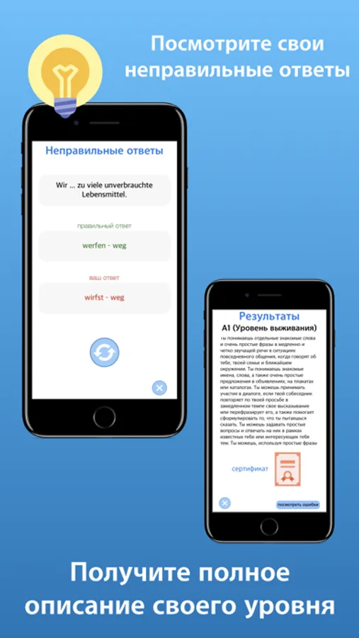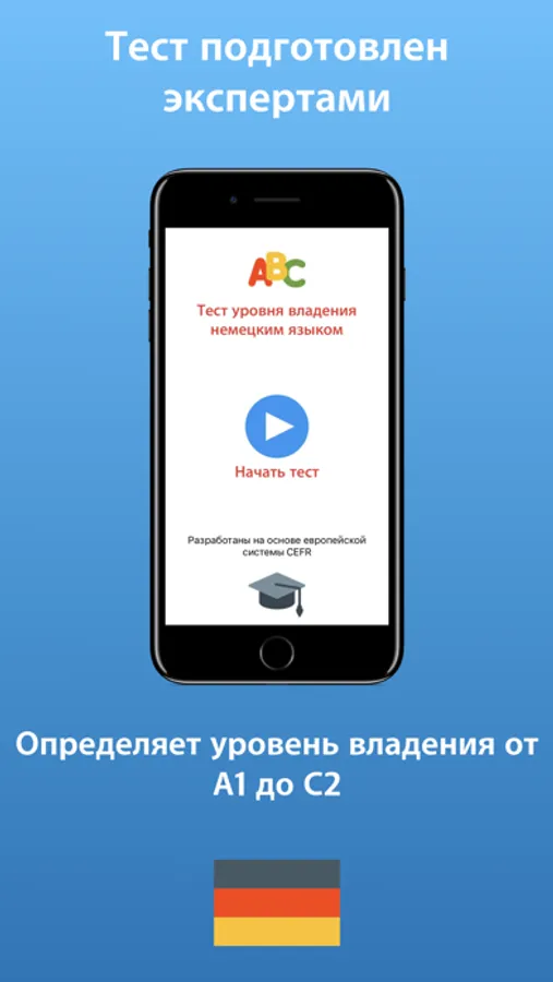 Тест для определения уровня владения немецким языком. Начиная от простых основ языка и заканчивая профессиональными терминами, подготовленно экспертами - носителями языка на основе Европейского стандарта. В приложении есть возможность не только пройти тест, но и посмотреть свои ошибки и получить фирменный сертификат о прохождении.