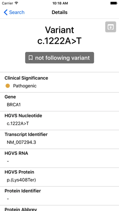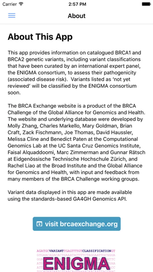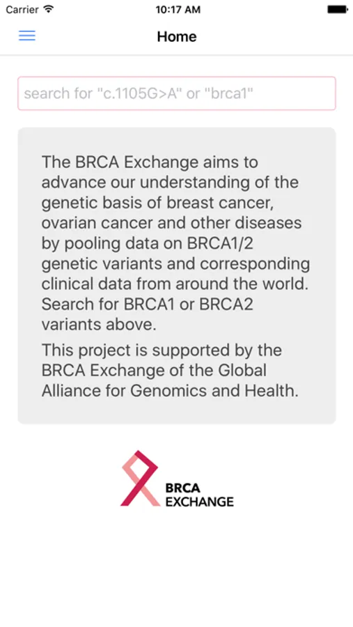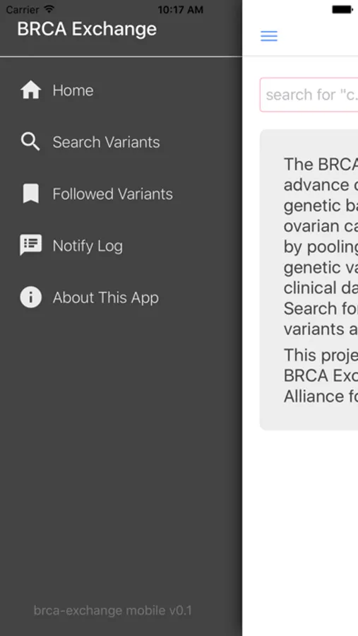 The BRCA Exchange is the largest public source of BRCA1 and BRCA2 variant information available. This app provides a simplified interface to search the BRCA Exchange for BRCA1/2 variant information and expert classifications of pathogenicity in real time. In addition to providing access to the variant information displayed in the web portal, users can follow variants of interest and receive notifications when their status is updated.