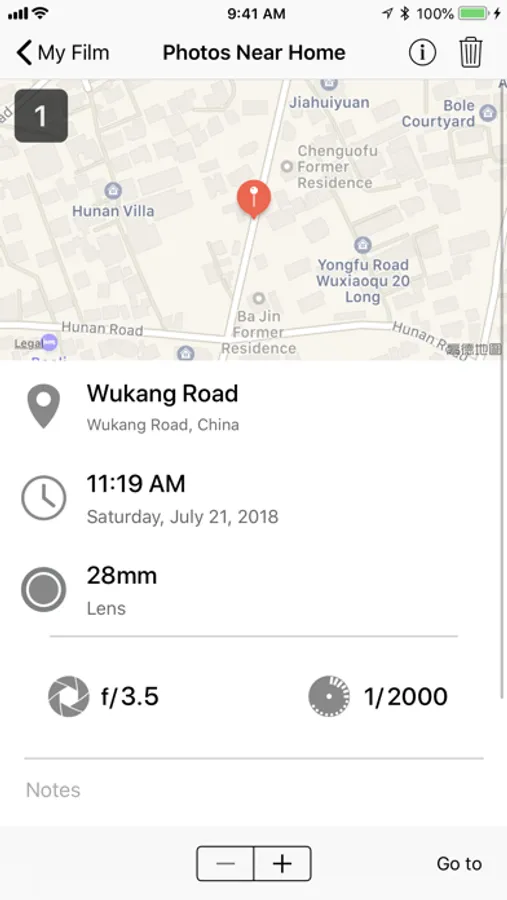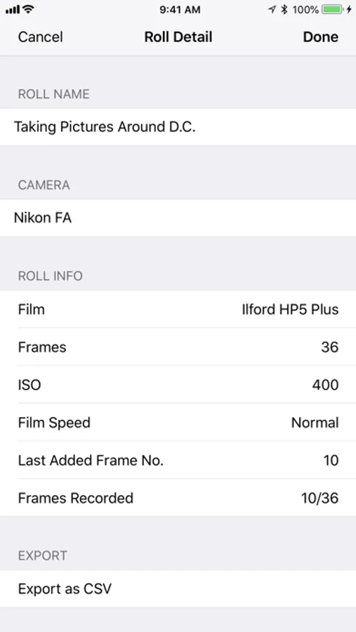 When you get your film developed, you may want to learn from your work, or simply, just share on social media with photo data included. Analog is also a great tool if you want to look back and see the settings for a specific frame of your roll. Go to your desired frame quickly with a slide control, or go to the next frame with a tap/swipe.