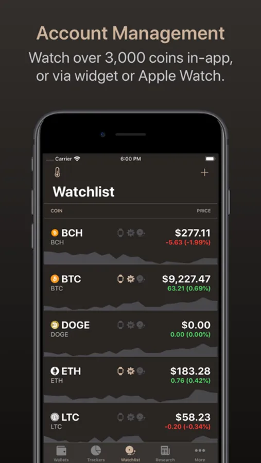 The Watchlist Screen comes up preset with a few coins. This is your introduction to the world of INDX01. Tap a coin and set it to show on your the widget page or on your Apple Watch.