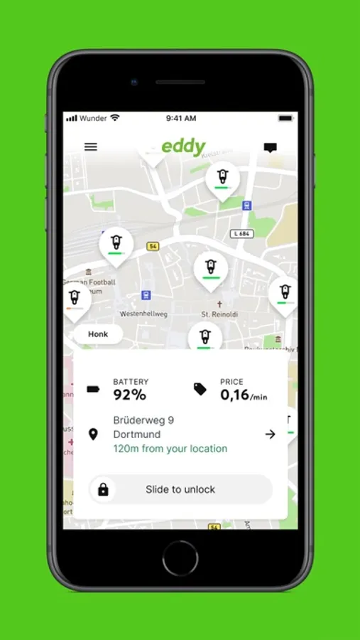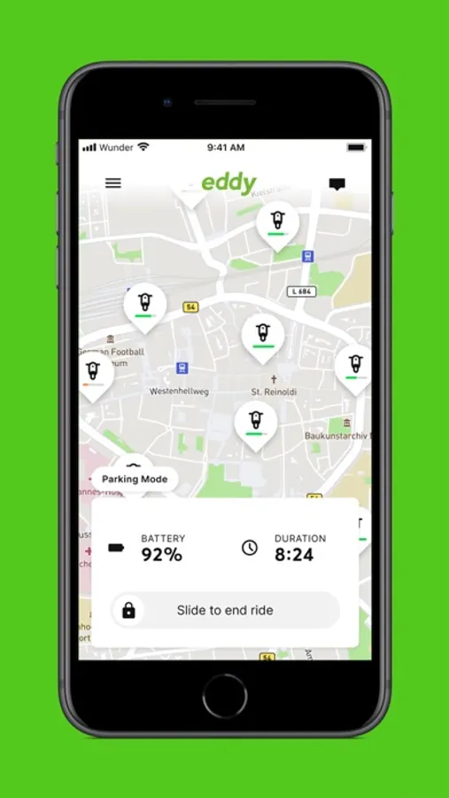 Parkplatzsuche, CO2-Ausstoß und Lärm gehören der Vergangenheit an. Rein-elektrisches Roller-Sharing gibt es nun auch in Düsseldorf. Die eddy-App ermöglicht die Lokalisierung, Reservierung und Anmietung der Roller. Einfach Roller in deiner Nähe finden und direkt für dich reservieren. Sobald du am Rollers stehst, kannst über die App du die Helmbox öfffnen, in der du zwei Helme in unterschiedlichen Größen sowie Hygienehauben zur Einmalverwendung und ein Handtuch findest, falls es doch mal was zu trocknen gibt. Helm auf, Box zu, und deinem Vergnügen steht nichts mehr im Wege - mit eddy kommst du entspannt und mit einem Lächeln auf dem Gesicht direkt an dein Ziel.