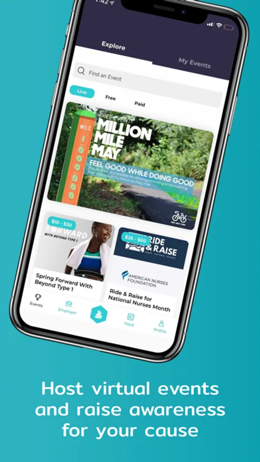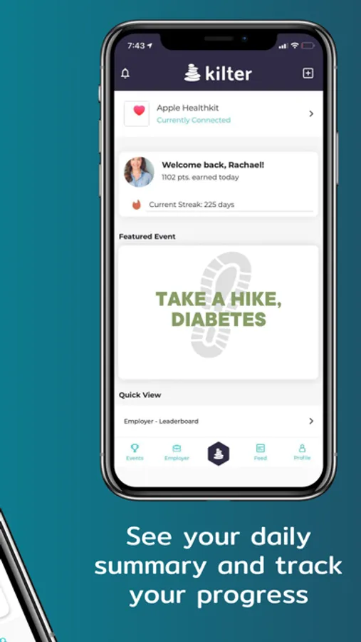 The free Kilter app allows you access to a number of different event programs: Non profit-hosted events, corporate donation matching, team-based company challenges, and virtual races & marathons.