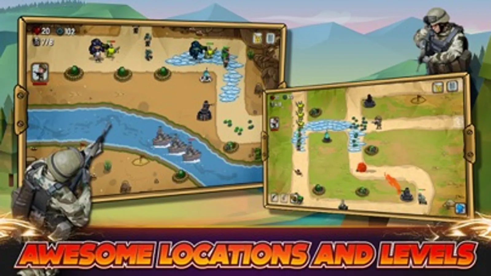 Fight on forests, secret lands, mountain, deserts, snow area and customizing your defensive strategy with different tower upgrades and specializations!