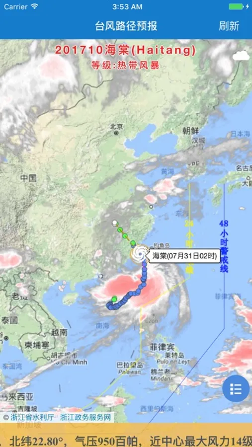 实时显示当前台风位置和未来台风预测路径,24小时降雨云图分析。