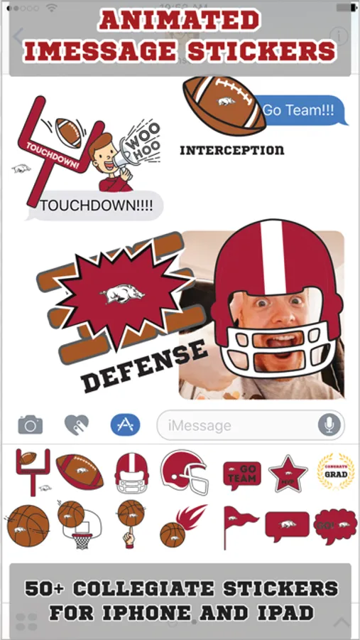 Animate your text and photo messages Hogs style with the Arkansas Razorback Animated+Stickers for iMessage!! The Arkansas Razorback Animated+Stickers for iMessage is an officially licensed Animated Sticker Pack from the University of Arkansas that includes Animated Stickers, Photo Stickers and Static Stickers. The Arkansas Razorback Animated+Sticker Pack for iMessage includes over 50 various static stickers, including, Foam Fingers, Helmets, Go Team Banners, Footballs, Basketballs, Sunglasses, Word Marks and more and a dozen animated stickers including: Cheering Fan, Touchdown, Defense, Interception, Fireworks, and more. These stickers can be used in iMessage to show your school spirit in text messages and on photos. Just drag them onto your message thread or onto a photo sent through iMessage and they will be shared instantly with whomever you are messaging with. Have fun and Go Hogs!!!