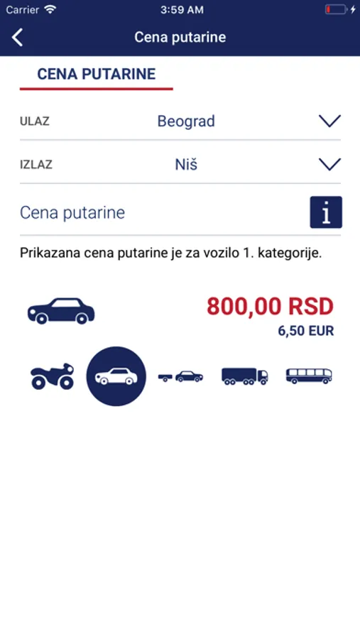 • Cena putarine - zadavanjem relacije i kategorije vozila dobija se cena putarine