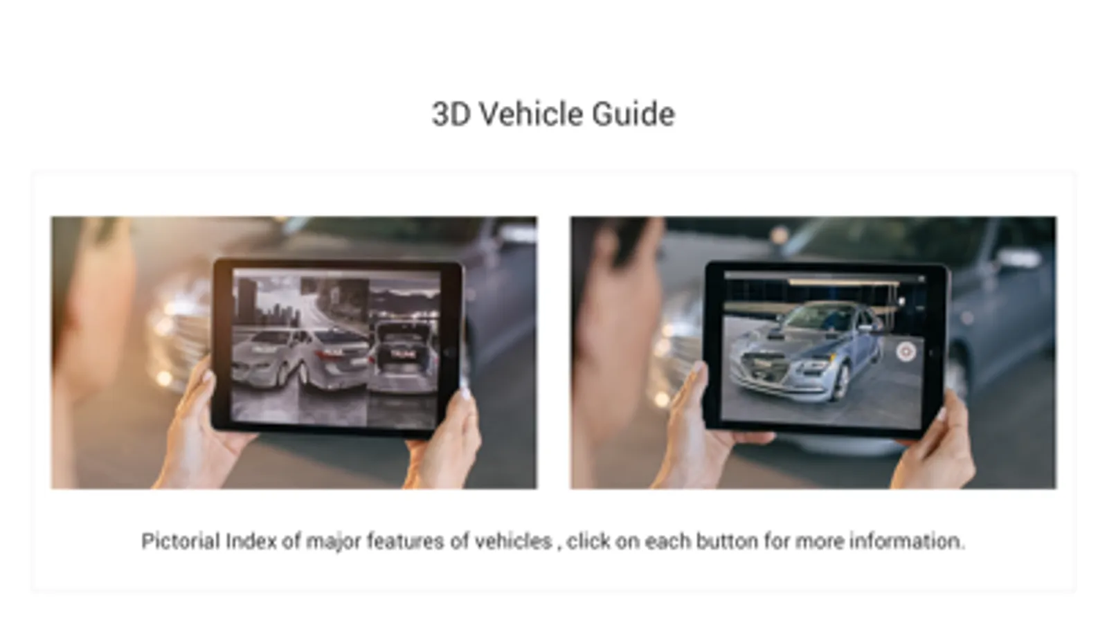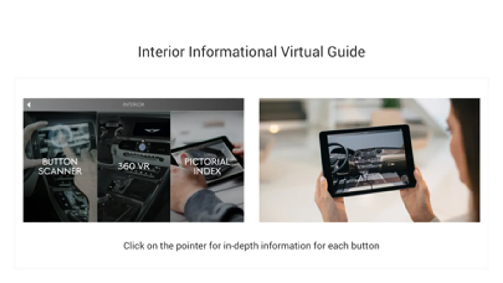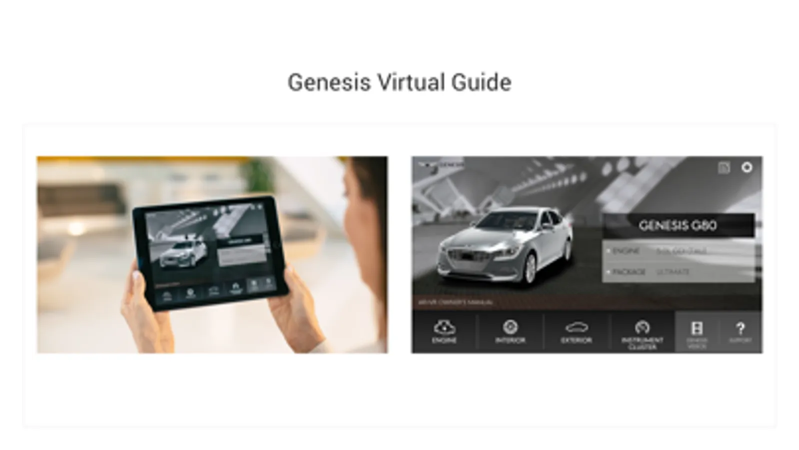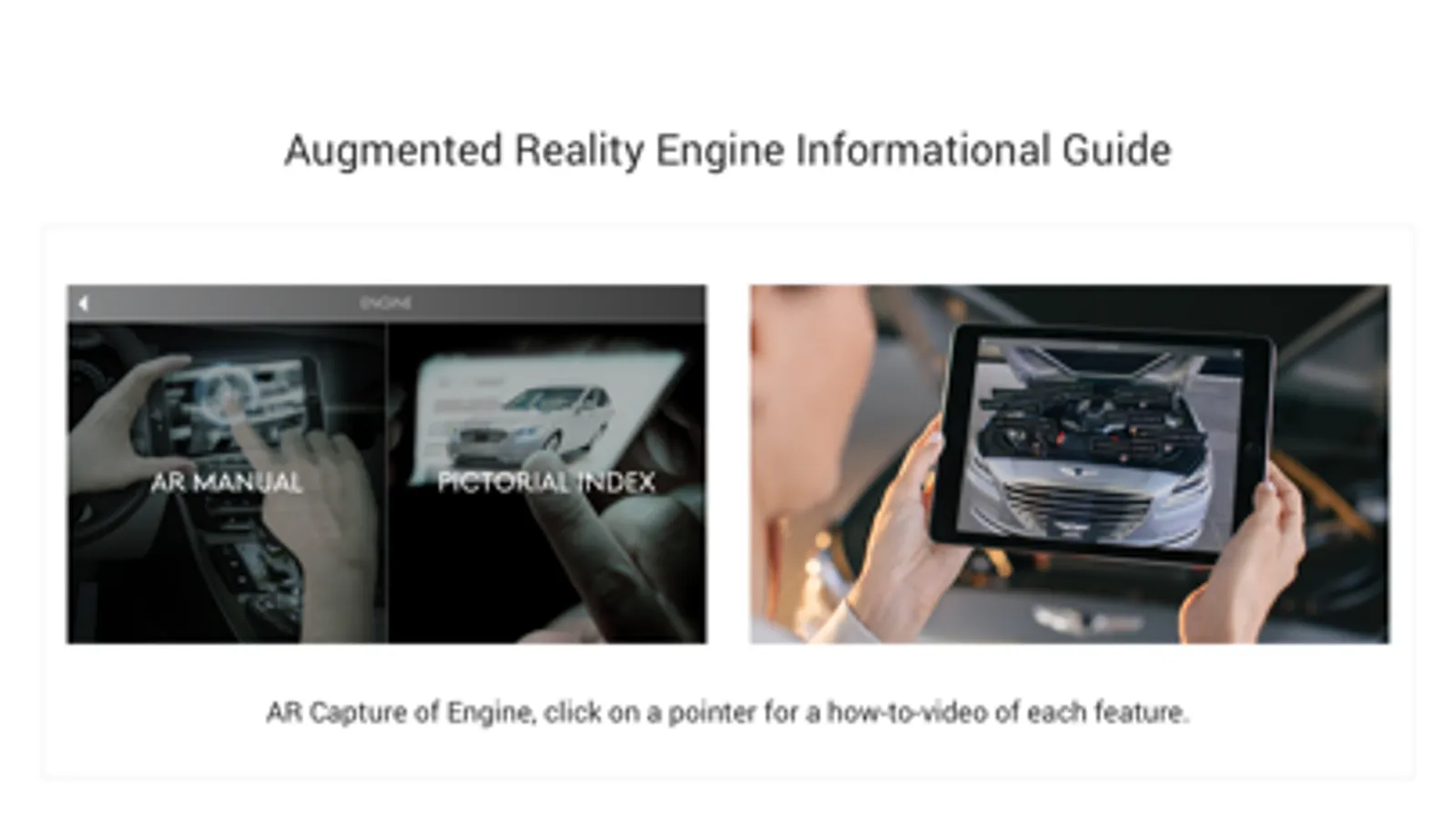 Genesis Virtual Guide is a modern take on the traditional owner’s manual, allowing consumers to use their smartphone to get how-to information for repairs, maintenance and vehicle features. Using 2-D and 3-D tracking technology, the Virtual Guide is able to deliver in-depth levels of information related to specific parts of Genesis vehicles.