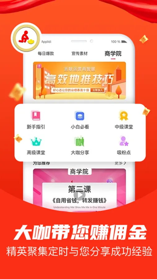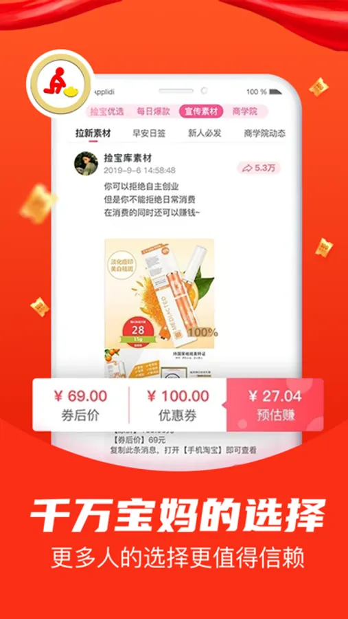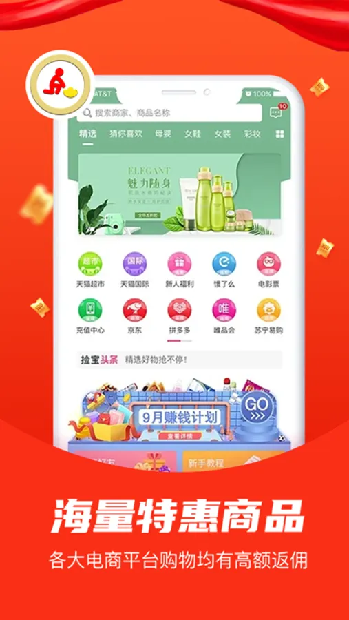 捡宝库-定位高端团购 打造高端供应链体系 【功能亮点】 1. 自营商城,高端好物【团购】 品牌正品,生产源头,无中间商,每天准点开团 2、好货爆料:重磅来袭,隐藏优惠一站式,淘宝、京东、唯品会,统统不放过!而且还送元宝哦 3、品牌特卖:超低价格捡漏,体验好物 4、每日签到,赚元宝 5. VIP权益, 触手可及