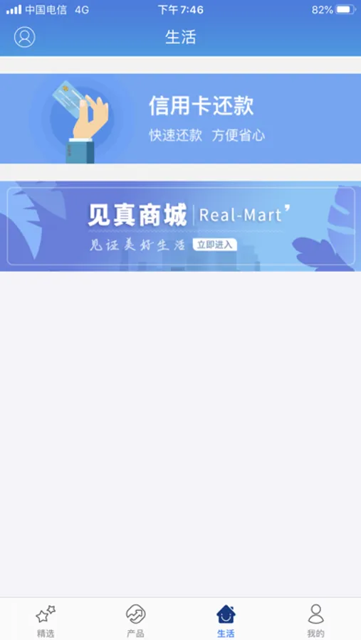 3、生活:集中提供各项生活类服务,包括信用卡还款、见真商城等功能;