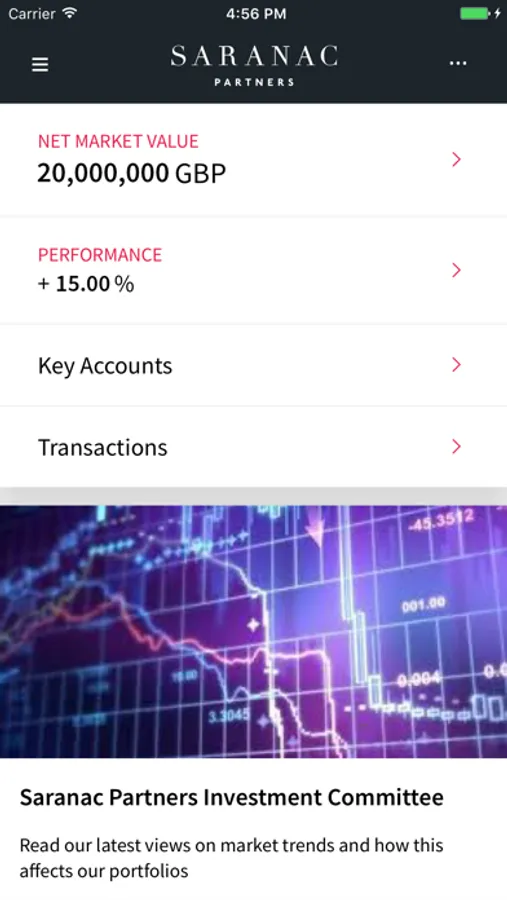 Saranac Partners Mobile, for iPhone and iPad, is designed for clients of Saranac Partners only. The app provides clear and transparent information on client holdings and investment performance. The main features of the app are position level granularity, real time pricing for all major markets, the ability to filter portfolios by different views and content that is personalised to clients. The application also includes functionality that allows clients to view, upload and store documentation.