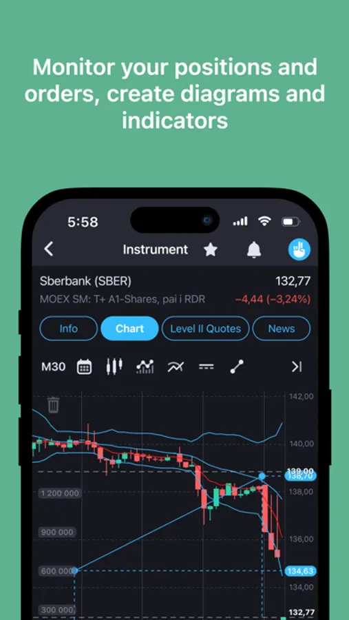 - Monitoring of trade dynamics with charts, including technical analysis indicators,