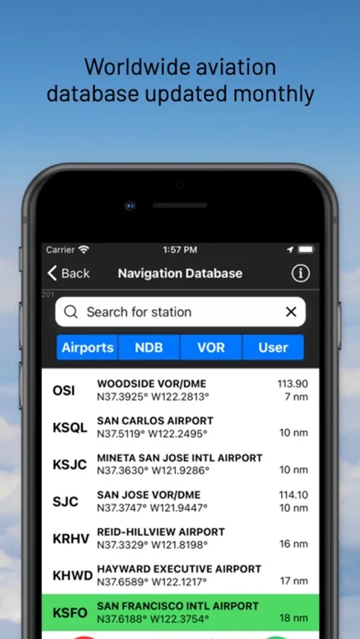 • Worldwide aviation database containing over 20k airports and radio navigation aids, updated monthly