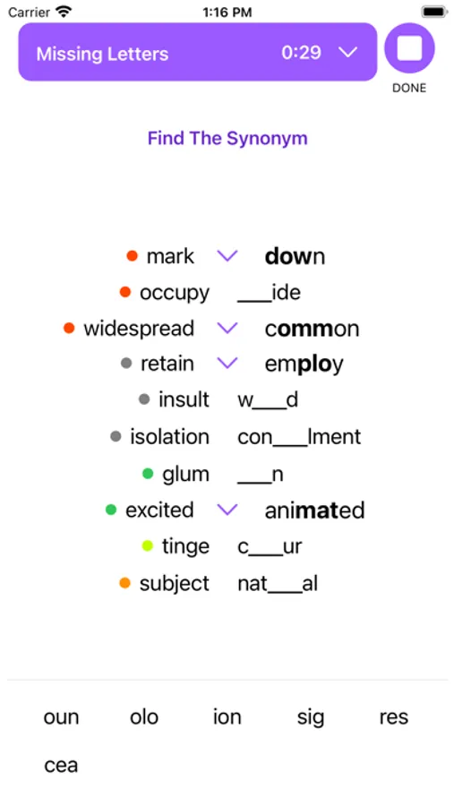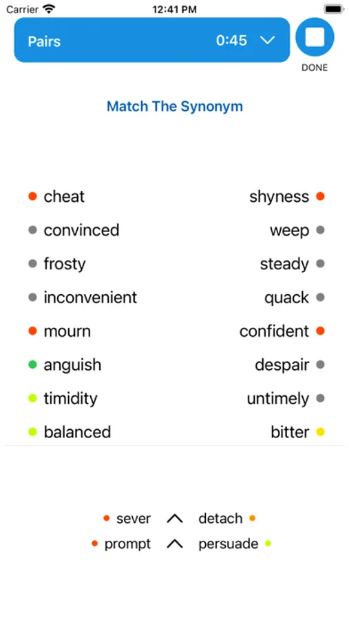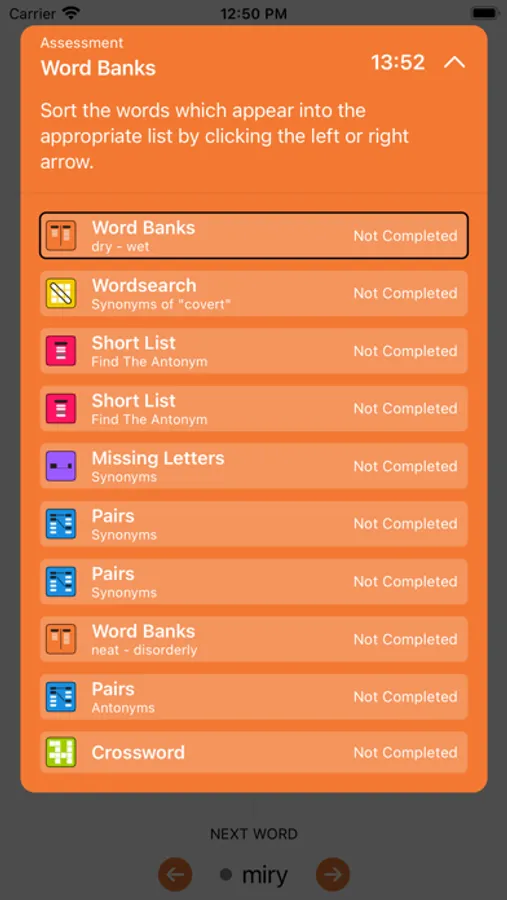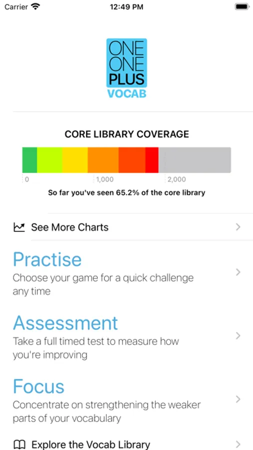 - ASSESSMENT: A longer multi-game test lasting around 15 minutes with words taken from any part of the core library. No hints or definitions are available in this mode so can better measure your current level of continuous improvement. Try to complete one Assessment at least every 1-2 weeks in order to measure progress over time.