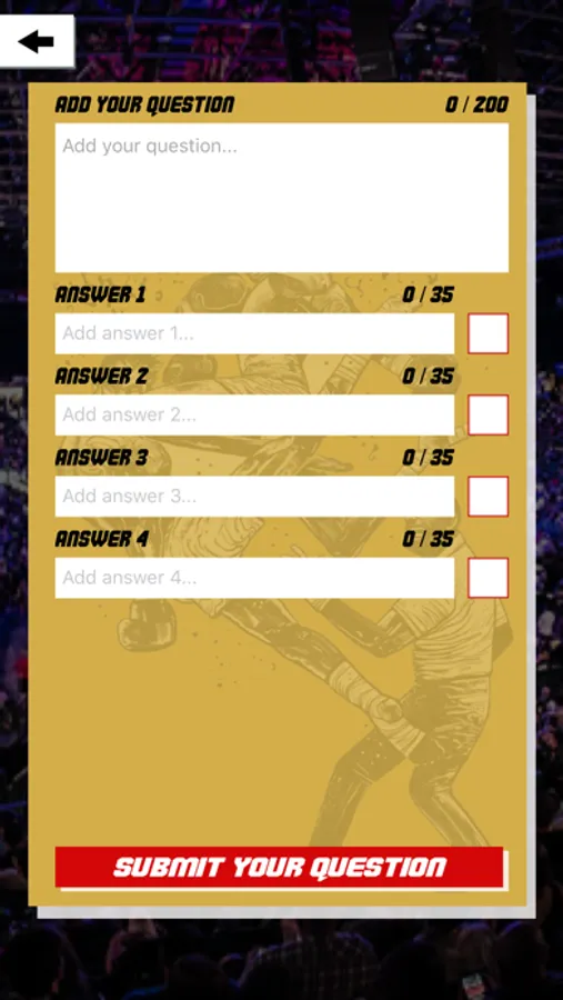 Upload your own question - we added the functionality for you to upload your own question. Send us questions about your favorite MMA fighters. We'll review the questions sent to us and we'll make them available to all the MMA Quest application users.