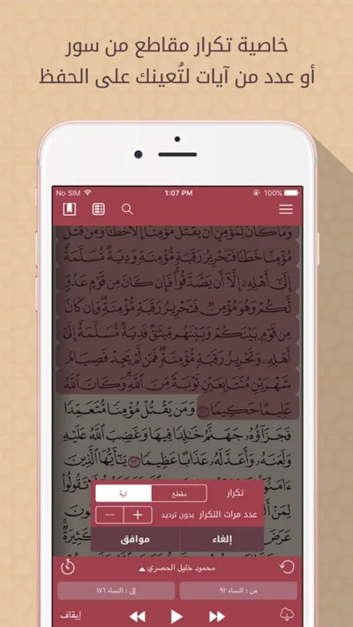 استعن بخاصية تكرار مقاطع محددة من السورة، لتعينك على الحفظ.