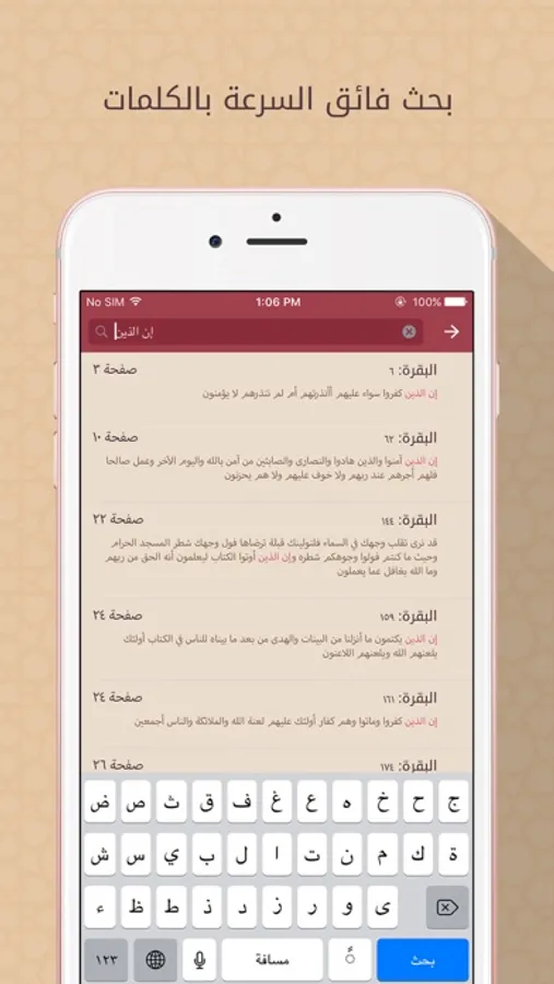 بحث لحظي فائق السرعة لتصل إلى أي آية، كلمة أو سورة بسهولة.
