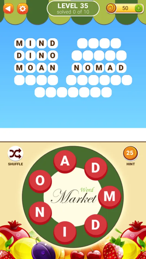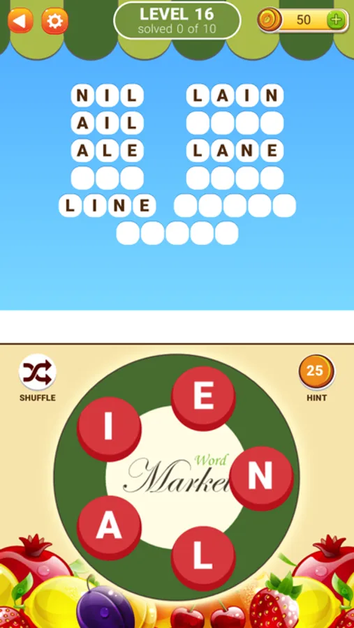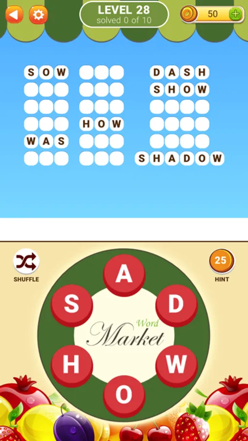 Second installment of the popular Word Market game with brand new set of puzzles. New in this game: you can now redeem hidden words for extra bonus coins. Swipe your finger over the letters on the plate to form a word and unlock a fruit. Apples, strawberries, oranges, plums... Healthy! Guess all the words, give your brain some vitamins!