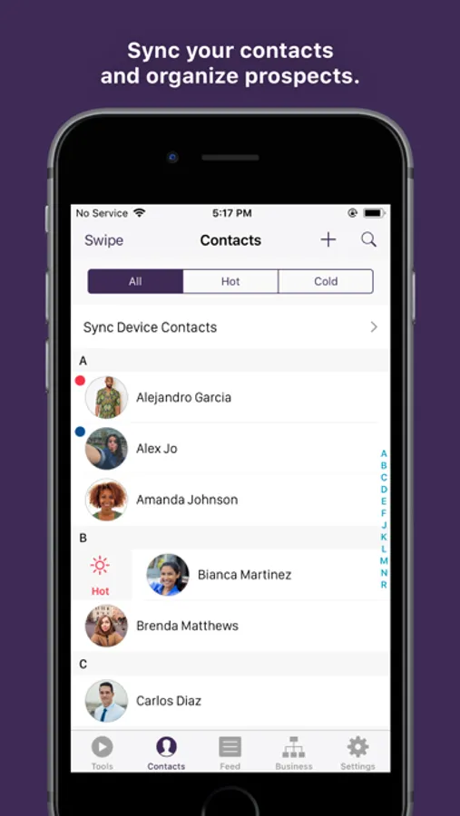 Contacts: Choose how to sync and manage your contacts. Swipe to sort them by interest level. You can make connections, add notes, or check out the Contact Feed to see the tools you've shared and contact actions.