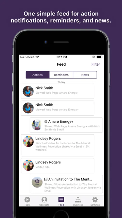 Feed: Keep track of everything you’ve shared and see what your contacts have viewed with notifications. You can even swipe notifications to mark them as a Reminder. News also brings all of the latest announcements and social posts from corporate straight to you in one convenient place!