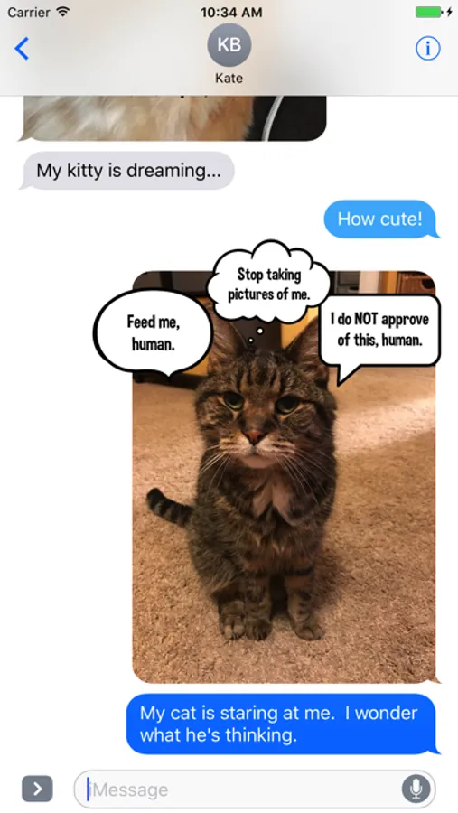Kitty Thoughts is a fun sticker pack that adds humor and personality to your pictures of cats and kittens. Is your cat staring at you endlessly? Snap a picture and add "Feed me, human!" or "I am not amused!" to give your photo an extra shot of personality.