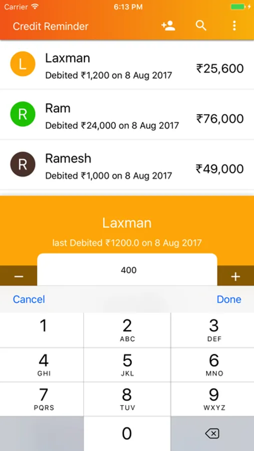 Credit Reminder helps shopkeepers to save the credit amount given to their customers and keep track of credit and debits of the customers.
