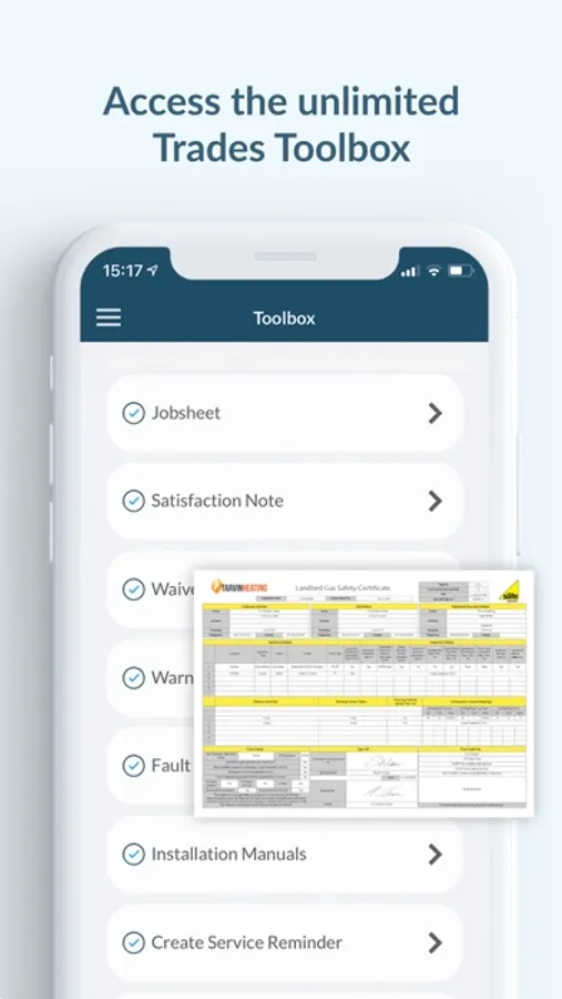 Save time and money with unlimited electronic forms, including industry certificates, Gas Safety Certs, maintenance records, waiver forms, jobs sheets, satisfaction notes and risk assessments.